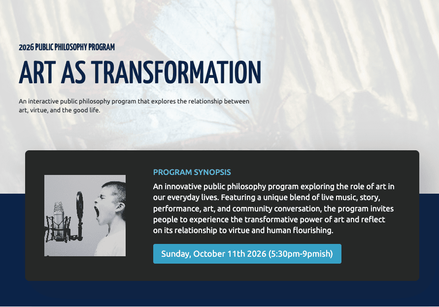 The Ming Opera House (Shriner’s Temple) 15 N. Jackson Street, Helena, Montana, United StatesAn innovative public philosophy program exploring the role of art in our everyday lives. Featuring a unique blend of live music by local musicians, story, performance, art, and community conversation with guest artists and scholars, this immersive program invites people to experience the transformative power of art and reflect on its relationship to virtue and human flourishing. Learn more here!